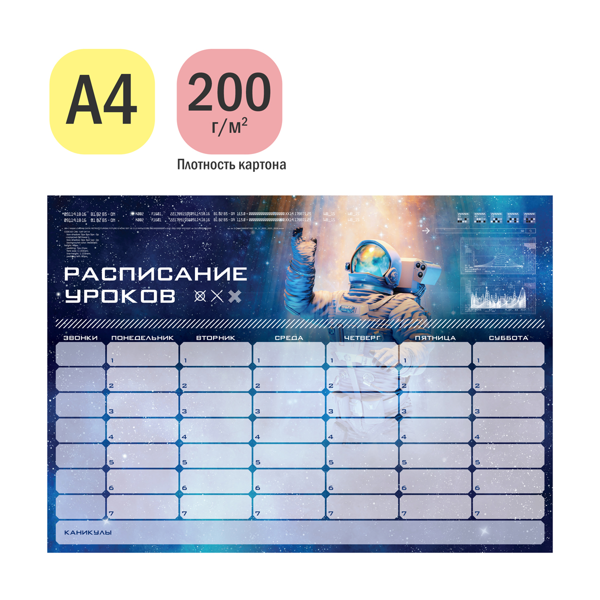 Расписание уроков с расписанием звонков А4 BG "Пиши-стирай. Космос"