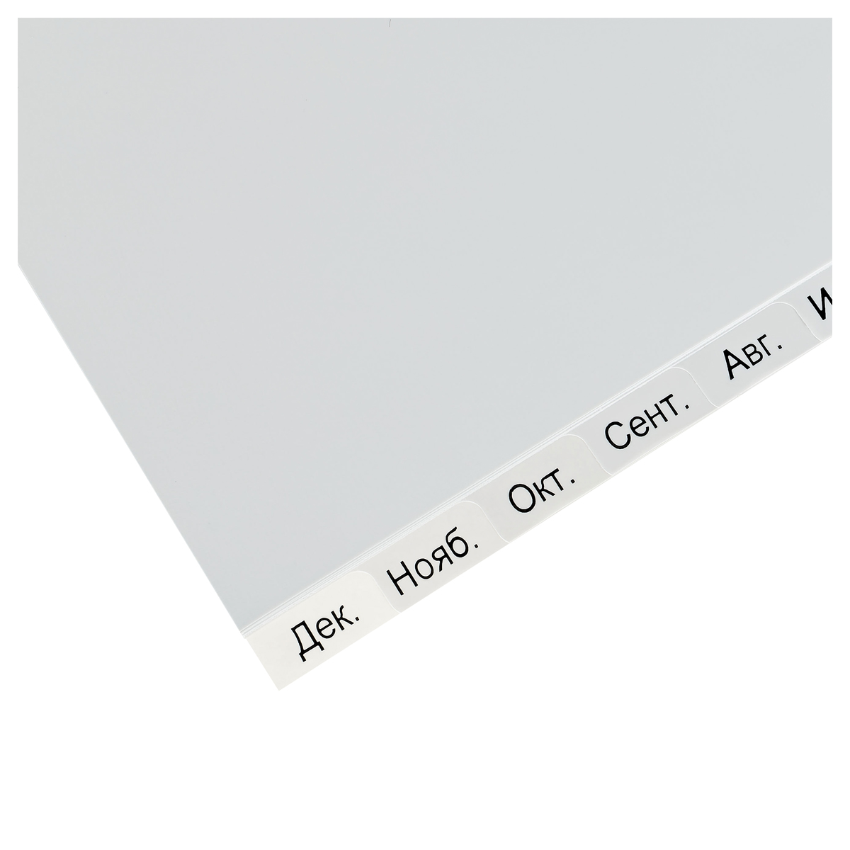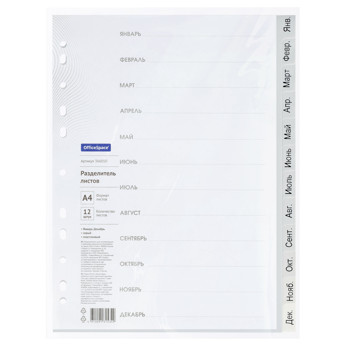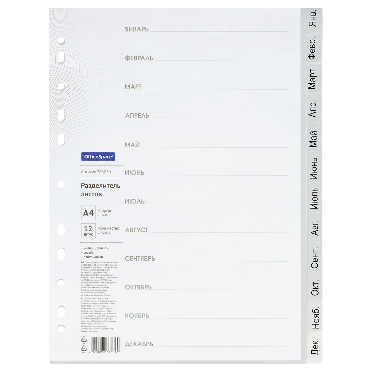 Пластиковые разделители листов OfficeSpace предназначены для сортировки и систематизации документов внутри папок. Обеспечивают сохранность и аккуратность листов. Изготовлены из пластика толщиной 120 мкм. Размер 224*297 мм. В комплект входят 12 листов серого цвета, обеспечивающих возможность сортировки документов по месяцам, а также титульный лист для оглавления. Удобны в использовании: перфорация позволяет подшивать разделители во все типы папок. <br/>• Размер: 224*297 мм;<br/>• Количество листов: 12;<br/>• Цвет: серый;<br/>• Наличие индексации: по месяцам.