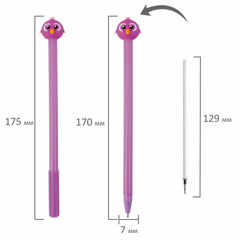 Шариковая ручка серии FUNNY YUMMY с ярким корпусом и оригинальным дизайном топперов в виде птенца. Благодаря привлекательному дизайну ее не захочется выпускать из рук, а чернила на масляной основе обеспечат мягкое плавное письмо. Диаметр игольчатого пишущего узла, равный 0,7 мм, создает линию письма, равную 0,35 мм. Длина сменного стержня составляет 129 мм. Цвет чернил - синий.