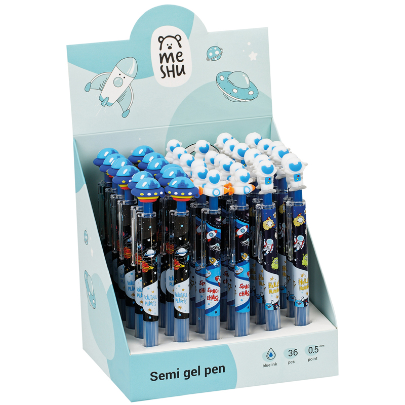 Шариковая автоматическая ручка MESHU Space Aliens станет ярким атрибутом отличного настроения на работе или учёбе. Диаметр пишущего узла – 0,5 мм. Благодаря этому ручка прекрасно подойдёт для любого стиля письма. Толщина линии письма – 0, 3 мм, а длина письма может достигать 260 метров. Изделие обладает необычным дизайном: ручка с рисунком на корпусе украшена мини-игрушкой в космической тематике. Благодаря чернилам синего цвета на масляной основе ручку можно ежедневно использовать в работе или учёбе. Предусмотрена возможность замены стержня.<br/>• Цвет чернил: синий;<br/>• Диаметр пишущего узла: 0,5 мм;<br/>• Форма корпуса: круглая;<br/>• Материал корпуса: пластик.