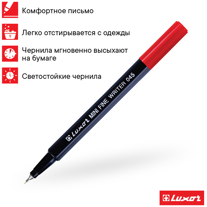 Особенность капиллярных ручек Luxor – это умение подстраиваться под силу нажима, из-за чего напряжение на руку при письме не ощущается. Изделия пишут тонкой равномерной линией, оставляя контрастный след. Наконечник изготавливается из твёрдого пластика, благодаря чему обеспечивается одинаковая толщина линий при разных наклонах ручки.