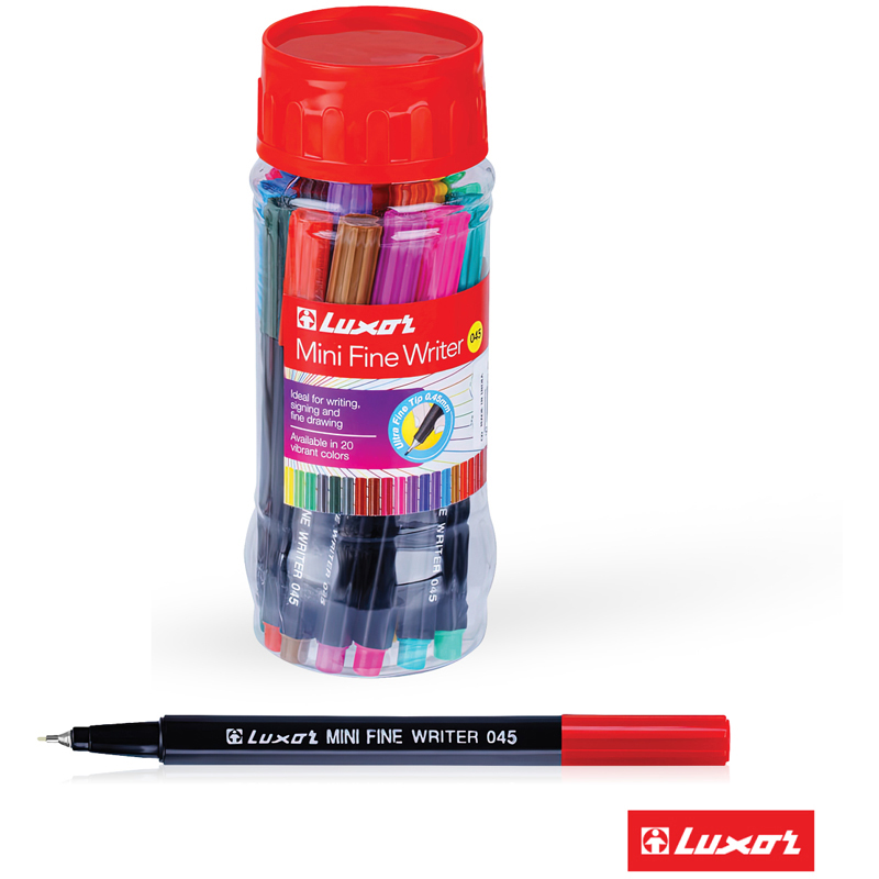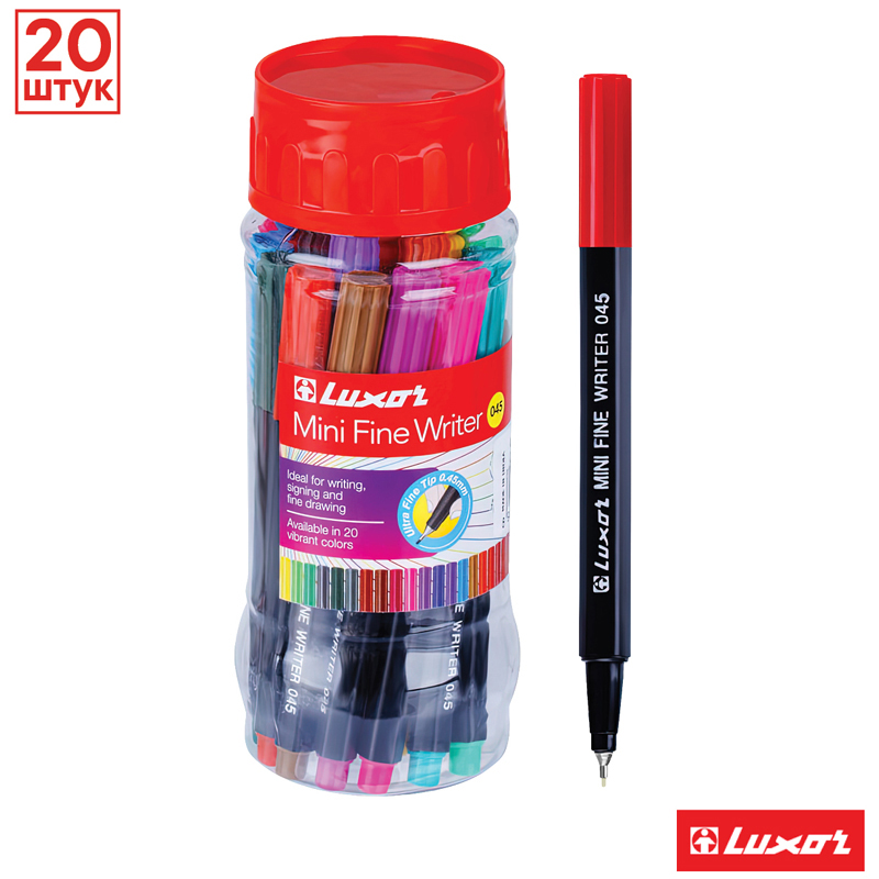 Набор капиллярных ручек Luxor Fine Writer – линер, тонко пишущий фломастер и чертёжный инструмент одновременно. Диаметр пишущего узла: 0,8 мм.<br/>Особенность капиллярных ручек Luxor – это умение подстраиваться под силу нажима, из-за чего напряжение на руку при письме не ощущается. Изделия пишут тонкой равномерной линией, оставляя контрастный след. Наконечник изготавливается из твёрдого пластика, благодаря чему обеспечивается одинаковая толщина линий при разных наклонах ручки.<br/>Светостойкие чернила на водной основе не выцветают под воздействием солнечных лучей и легко отстирываются с одежды. Чернила мгновенно высыхают на бумаге, поэтому надписи и рисунки не размазываются. Стильный чёрный цвет корпуса. Рисуйте ярко и пишите мягко вместе с капиллярными ручками Luxor.<br/>• Цвет чернил: ассорти;<br/>• Количество в наборе: 20; <br/>• Форма корпуса: шестигранная;<br/>• Диаметр пишущего узла: 0,8 мм.