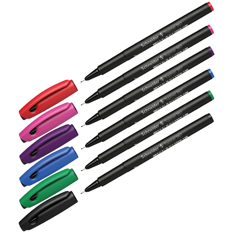 Набор капиллярных ручек Schneider Topliner 967 в стильном дизайне. Капиллярные ручки предназначены для письма, рисования, раскрашивания и черчения. Диаметр пишущего узла ручки составляет 0,4 мм, толщина линии письма – 0,4 мм. Круглый пластиковый чёрный корпус.Цвет колпачка соответствует цвету чернил. В наборе 6 капиллярных ручек: синего, чёрного, красного, зелёного, фиолетового и розового цвета. Упакованы в ПВХ чехол с европодвесом. Письменные принадлежности Schneider разрабатываются и производятся только в Германии.