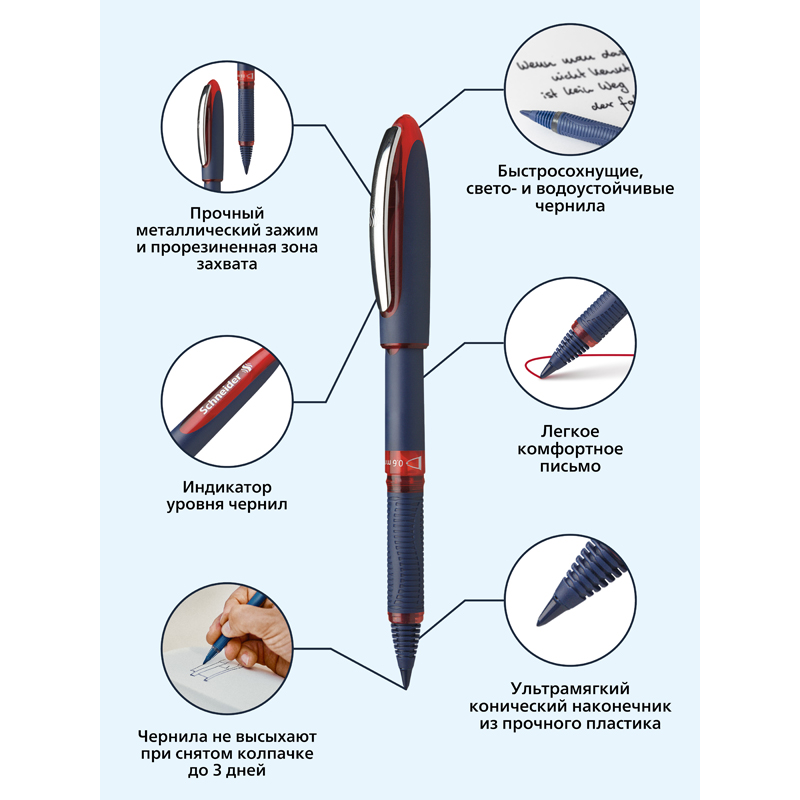 Ручка-роллер Schneider One Business с круглым прорезиненным корпусом и металлическим клипом. Диаметр пишущего узла ручки составляет 0,8 мм, толщина линии письма – 0,6 мм. Длина письма может достигать 2000 метров! Чернильный роллер с ультрамягким наконечником из прочного пластика.Также есть окно-индикатор чернил. Цвет элементов корпуса соответствует красному цвету чернил. Быстросохнущие, свето- и водоустойчивые чернила соответствуют международному стандарту качества ISO 14145-2 и отлично подходят для заполнения и подписи документов. Письменные принадлежности Schneider разрабатываются и производятся только в Германии.