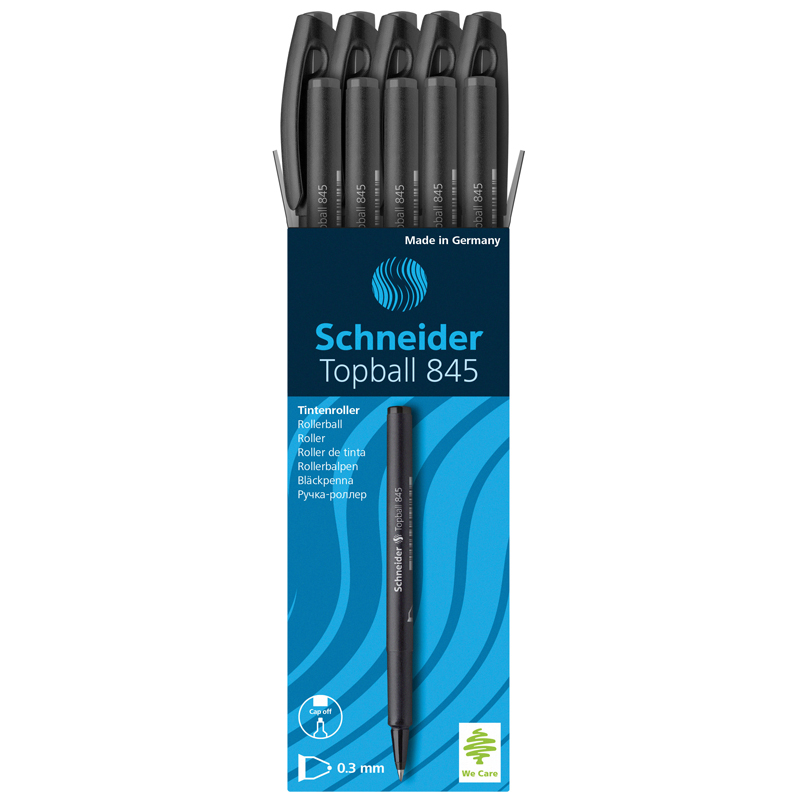 Ручка-роллер Schneider TopBall 845 с круглым стильным чёрным корпусом и пластиковым клипом. Диаметр пишущего узла ручки составляет 0,5 мм, толщина линии письма – 0,3 мм. Длина письма до 2000 метров. Удобный чернильный одноразовый роллер. Цвет элементов корпуса соответствует цвету чернил. Письменные принадлежности Schneider разрабатываются и производятся только в Германии. В упаковке 10 ручек.<br/>• Цвет чернил: чёрный;<br/>• Толщина линии письма: 0.3 мм;<br/>• Длина линии письма: 2000 м<br/>• Цвет корпуса: чёрный;<br/>• Прорезиненный грип: нет; <br/>• Количество штук в упаковке: 10; <br/>• Страна производства: Германия