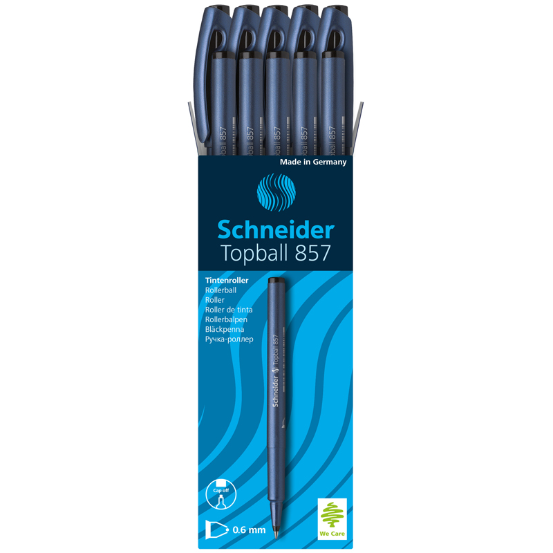 Ручка-роллер Schneider TopBall 857 с круглым стильным тёмно-синим корпусом и пластиковым клипом. Диаметр пишущего узла ручки составляет 0,8 мм, толщина линии письма – 0,6 мм. Длина письма до 1800 метров. В упаковке 3 ручки. Удобный чернильный одноразовый роллер. Цвет элементов корпуса соответствует цвету чернил. Письменные принадлежности Schneider разрабатываются и производятся только в Германии.