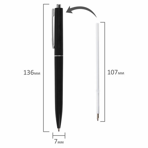 Классическая автоматическая шариковая ручка с корпусом ярких цветов ассорти. Кнопка, клип и кольцо посередине выполнены из металла. Укомплектована стержнем синего цвета длиной 107 мм со стандартным наконечником. Диаметр пишущего узла 0,7 мм создает линию письма, равную 0,5 мм. Цвет чернил – синий.