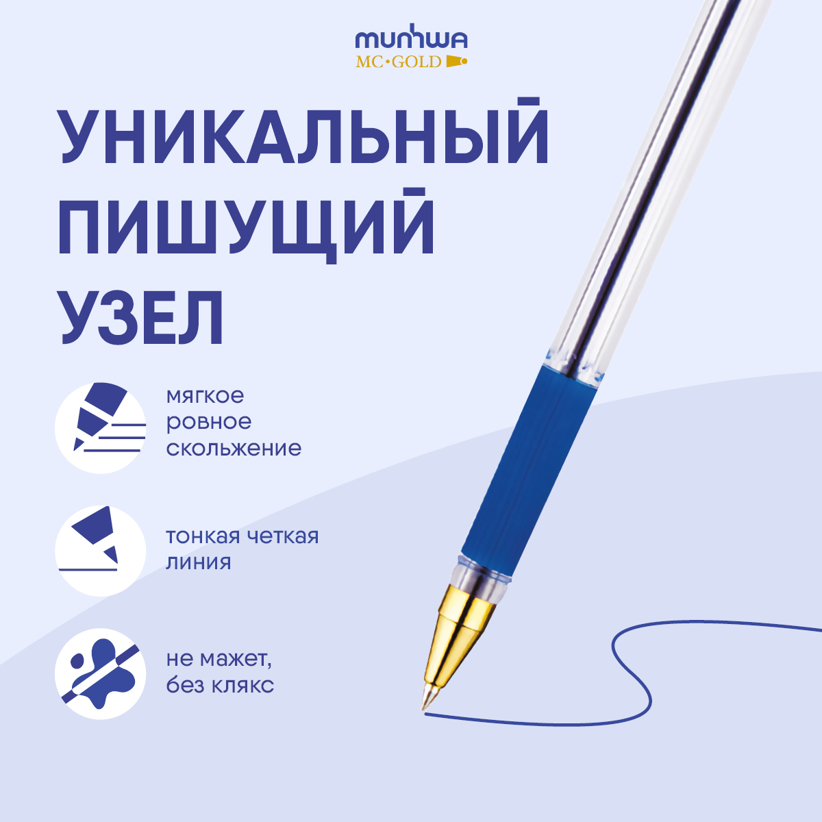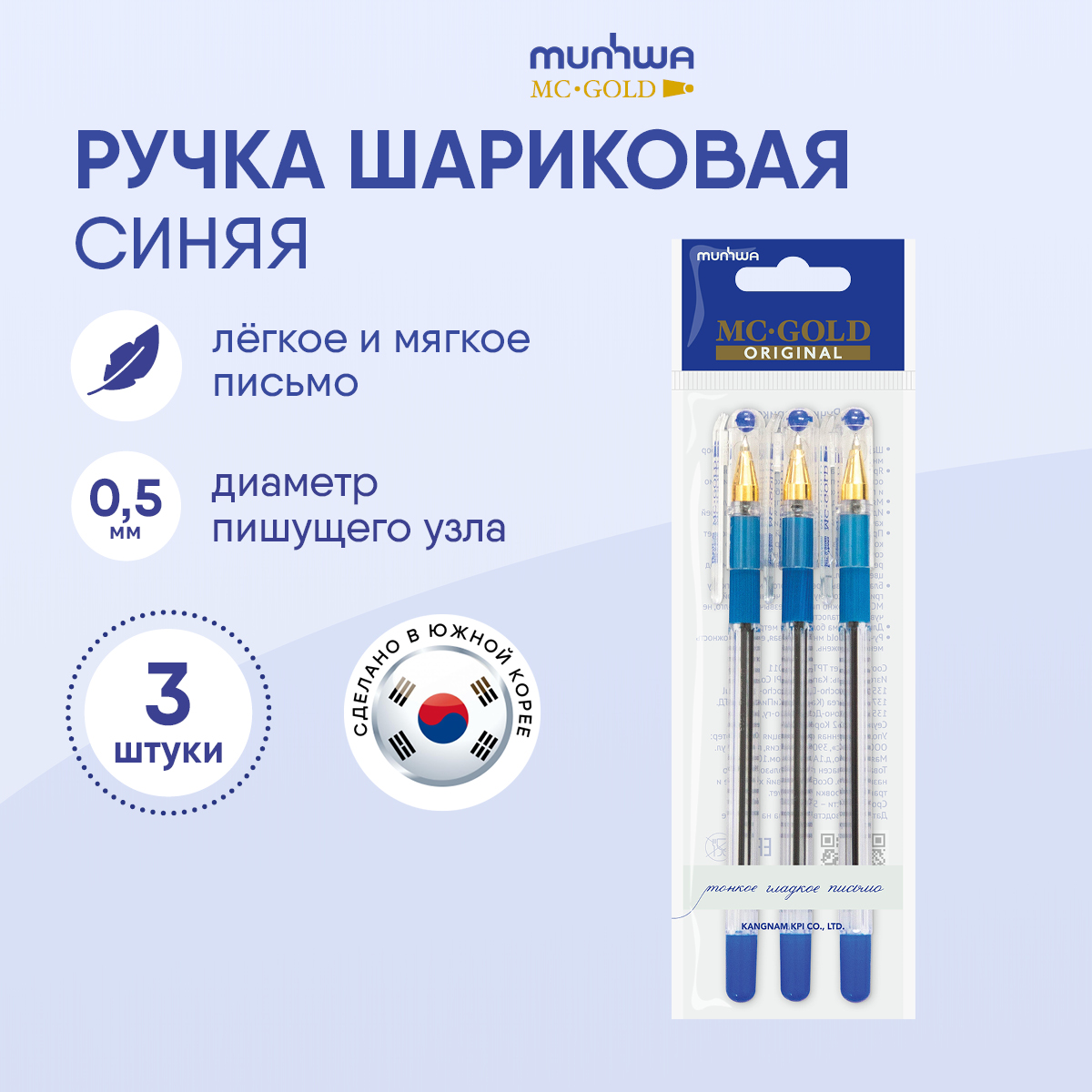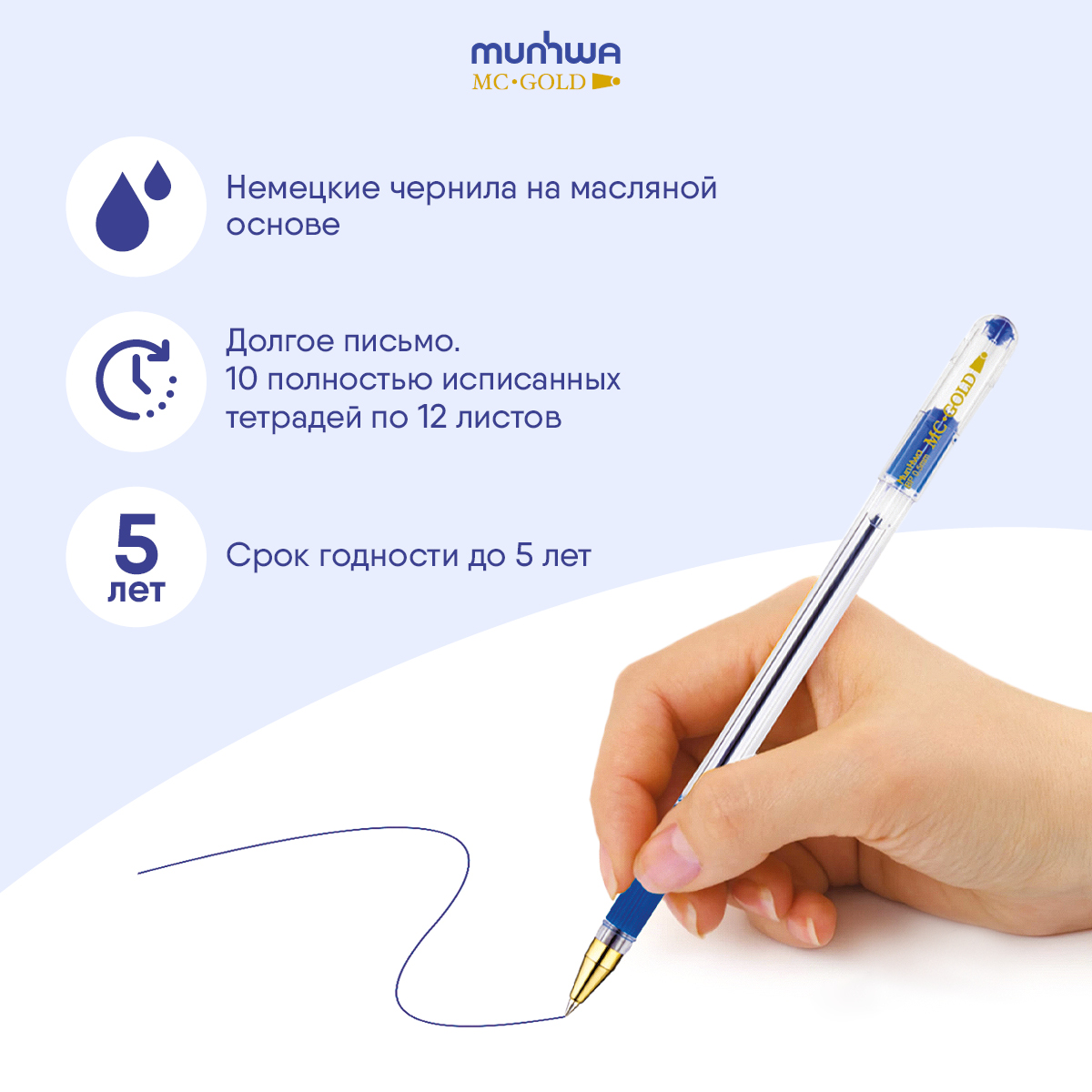 Легендарная шариковая ручка MunHwa MC Gold - одна из самых узнаваемых шариковых ручек. Диаметр пишущего узла составляет 0,5 мм. Толщина линии письма – 0,3 мм, а длина линии письма – 1200 м. В упаковке 3 штуки. Ручка проработана до мельчайших деталей: прозрачный шестигранный корпус отлично диаметром 8,3 мм сочетается с золотым наконечником и ребристым противоскользящим грипом под синий цвет чернил. Уникальные чернила на масляной основе обеспечивают мягкое, ровное письмо и уверенное скольжение по бумаге. У ручки MunHwa MC Gold есть возможность менять стержень, она многоразовая. Сочетание комфортного письма и безупречного стильного дизайна сделало её абсолютным лидером российского рынка.