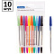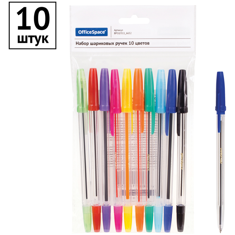 Набор шариковых ручек OfficeSpace удобен и приятен в использовании. Внутри ручки в пластиковом корпусе – качественные немецкие чернила. На каждой ручке есть колпачок с клипом – можно закрепить её на одежде или тетради. Диаметр пишущего узла 1,0 мм, благодаря чему ручка оставляет широкую линию и мягко пишет без нажима. Цвет чернил – ассорти. Цвет деталей корпуса соответствует цвету чернил. Всего в наборе 10 цветов: синий, голубой, желтый, оранжевый, зеленый, светло-зеленый, светло-голубой, красный, черный, розовый. Набор упакован в пакет с ероподвесом.<br/>• Цвет чернил: ассорти;<br/>• Толщина линии письма: 0,8 мм;<br/>• Цвет корпуса: прозрачный;<br/>• Количество штук в упаковке: 10;<br/>• Тип упаковки: блистер с ероподвесом.