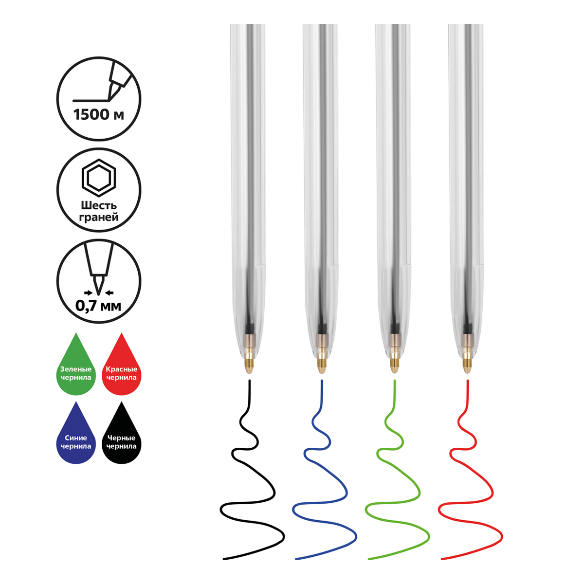 Набор шариковых ручек СТАММ 4 шт. с чернилами синего, красного, зеленого и черного цвета. Благодаря классической шестигранной форме корпуса ручка комфортно лежит в руке. Прозрачный корпус позволяет контролировать расход чернил. Диаметр пишущего узла: 0,7 мм. Длина стержня: 133 мм. Износостойкий наконечник и чернила на масляной основе обеспечивают мягкое, ровное и комфортное письмо. Изделие изготовлено из качественных материалов, и идеально сочетает в себе функциональность и современный дизайн. Ручки бренда в июле 2022 года стали первыми ручками отечественного производства в реестре Министерства промышленности и торговли России. <br/>• Цвет чернил: синий, красный, зеленый и черный;<br/>• Цвет корпуса: прозрачный;<br/>• Диаметр пишущего узла: 0,7 мм;<br/>• Форма корпуса: шестигранная;<br/>• Вентилируемый колпачок: да;<br/>• Упаковка: пакет с европодвесом;<br/>• Количество: 4 шт.