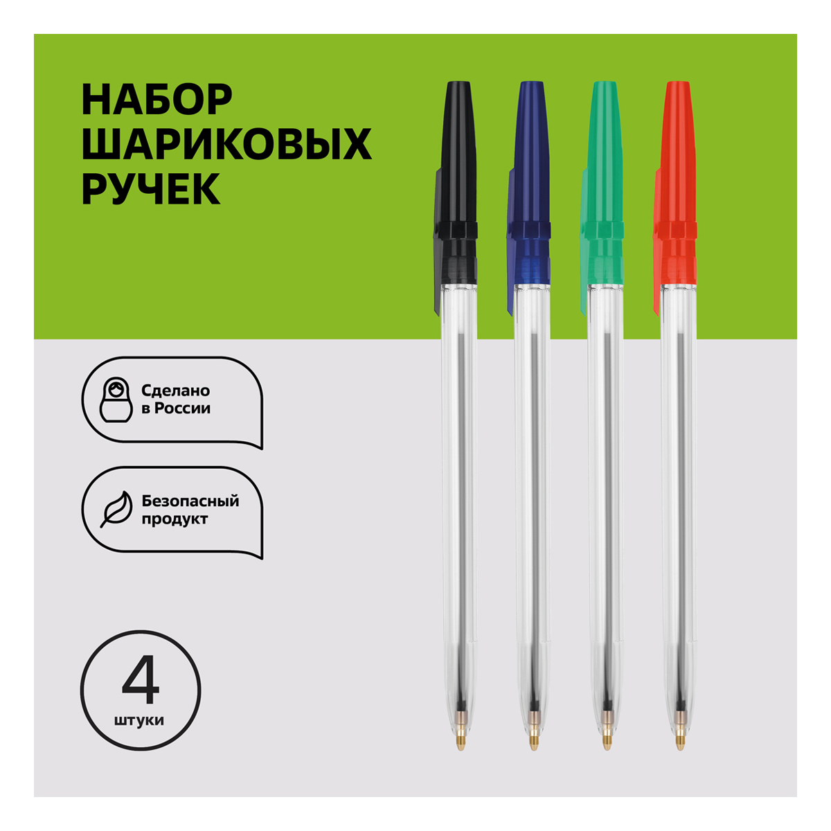 Набор шариковых ручек СТАММ 4 шт. с чернилами синего, красного, зеленого и черного цвета. Благодаря классической шестигранной форме корпуса ручка комфортно лежит в руке. Прозрачный корпус позволяет контролировать расход чернил. Диаметр пишущего узла: 0,7 мм. Длина стержня: 133 мм. Износостойкий наконечник и чернила на масляной основе обеспечивают мягкое, ровное и комфортное письмо. Изделие изготовлено из качественных материалов, и идеально сочетает в себе функциональность и современный дизайн. Ручки бренда в июле 2022 года стали первыми ручками отечественного производства в реестре Министерства промышленности и торговли России.