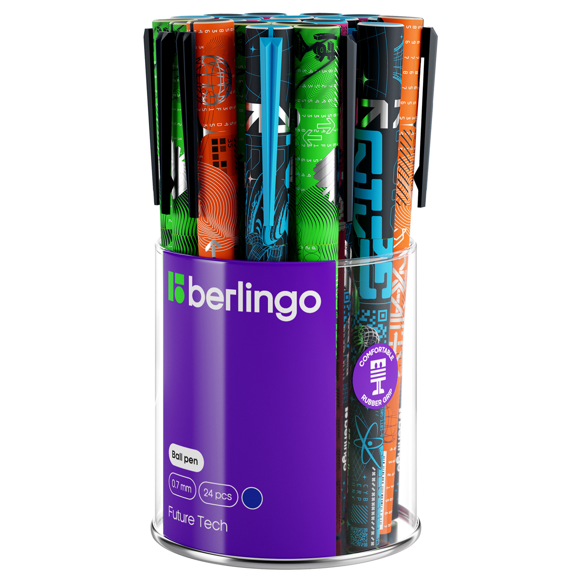 Ручка шариковая с ярким дизайном коллекционной серии Berlingo "Future Tech" позволит выразить себя и передать свои идеи не только на бумаге. Диаметр пишущего узла − 0,7 мм, толщина линии письма − 0,5 мм. Цвет чернил − синий. Удобная и привлекательная упаковка − дисплей-туба 24 шт.<br/>Уникальная запатентованная технология Smart Ink обеспечивает лёгкое и приятное письмо без усилий за счёт чернил пониженной вязкости, специальной конструкции пишущего узла и инновационных материалов шарика. <br/>• Технология Smart Ink;<br/>• Цвет чернил: синий;<br/>• Толщина линии письма: 0,5 мм;<br/>• Длина письма: 800 м;<br/>• Цвет корпуса: ассорти (4 дизайна).