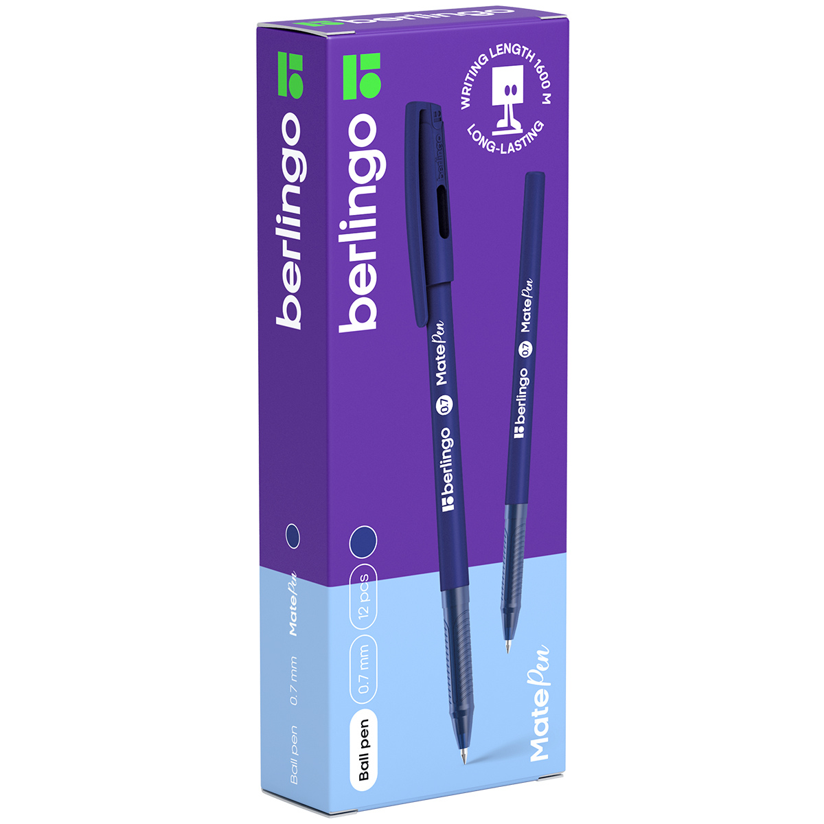 Шариковая ручка Berlingo MatePen - идеальный инструмент для повседневных записей. Эта модель станет оптимальным выбором для школьников, студентов и всех, кто привык много писать на уроках, лекциях или в офисе.<br/>Ручка оснащена усиленным корпусом, который не ломается даже при сильном нажатии, что гарантирует долгий срок службы даже при интенсивном использовании. Увеличенное количество чернил обеспечивает длину письма в 1600 метров, позволяя вам забыть о частой замене пишущих принадлежностей. Классические шариковые чернила не мажут и гарантируют чистое письмо.<br/>Пишущий узел диаметром 0,7 мм делает модель универсальным выбором, подходящим большинству пользователей, а удобный пластиковый клип позволяет надежно закрепить ручку на кармане рубашки, в пенале или ежедневнике.<br/>Ручки Berlingo MatePen поставляются в коробочках по 12 штук.