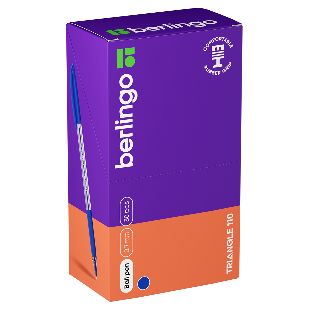 Одноразовая шариковая ручка Berlingo Triangle 110, оснащенная вентилируемым колпачком и пластиковым клипом. Диаметр пишущего узла составляет 0,7 мм, благодаря чему ручка прекрасно подходит для любого стиля письма. Корпус ручки имеет эргономичную трехгранную форму, а цвет деталей соответствует цвету чернил. Резиновый эргономичный упор для пальцев предотвращает усталость и скольжение пальцев при письме. Толщина линии письма – 0,5 мм, а длина – 1000 м. Уникальная запатентованная технология Smart Ink обеспечивает лёгкое письмо благодаря чернилам пониженной вязкости, специальной конструкции и особым материалам пишущего узла. Такими чернилами можно писать без дополнительных усилий даже при лёгком касании бумаги. Упакованы в картонную коробку по 30 штук.<br/>• Технология: Smart Ink;<br/>• Цвет чернил: синий;<br/>• Толщина линии письма: 0,5 мм;<br/>• Длина письма: 1000 м;<br/>• Цвет корпуса: прозрачный;<br/>• Количество штук в упаковке: 30;<br/>• Тип упаковки: картонная коробка