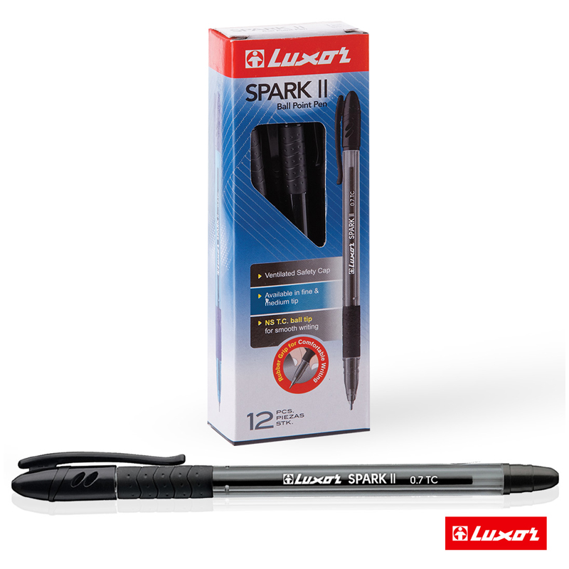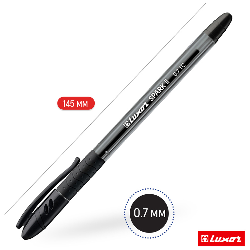 Шариковая ручка Luxor Spark II - функциональная тонкая ручка для ежедневного использования. Диаметр пишущего узла 0,7 мм, что говорит о том, что изделие подходит для любого типа письма. Толщина линии письма составляет 0,5 мм. Набор из 12 ручек упакован в картонную коробку. Чёрная ручка имеет чернила чёрного цвета и идеально подходит для учебы, работы, для ведения документооборота, заметок в ежедневнике, рисунков в скетчбуке. Изделия не имеют привычного кнопочного механизма подачи стержня, однако имеют прочный колпачок с с пластиковым клипом. Он позволит прикрепить ручку к ежедневнику или блокноту. Чернила изготовлены на масляной основе и благодаря пониженной вязкости они обеспечивают мягкое ровное письмо и уверенное скольжение по бумаге. Мягкий резиновый грип снижает давление на пальцы рук при письме. Легкий и тонкий корпус лаконичен по форме и удобен при письме. <br/>• Цвет чернил: чёрный;<br/>• Толщина линии письма: 0,5;<br/>• Грип-зона: да;<br/>• Цвет корпуса: тонированный чёрный;<br/>• Количество штук в упаковке: 12;<br/>• Тип упаковки: картонная коробка.