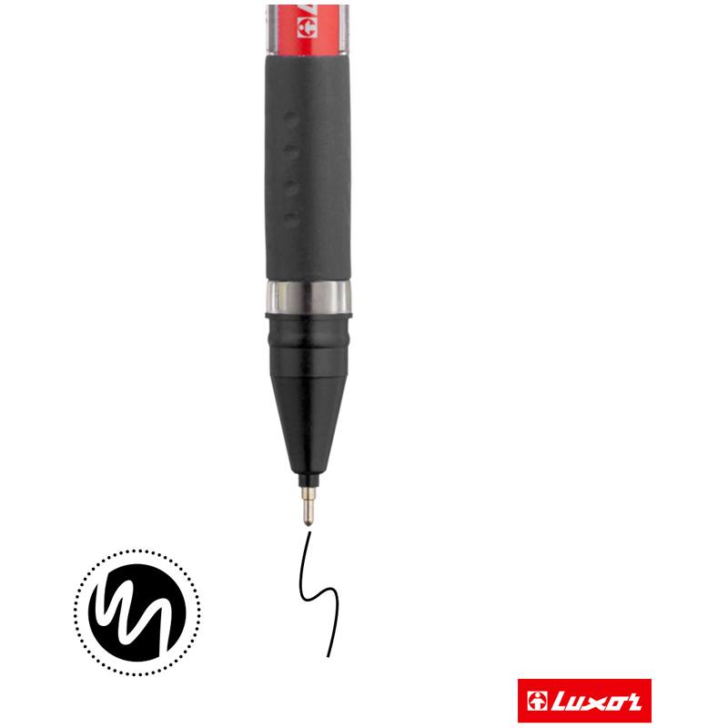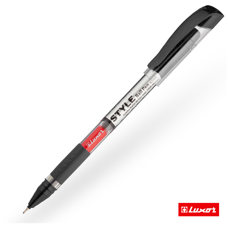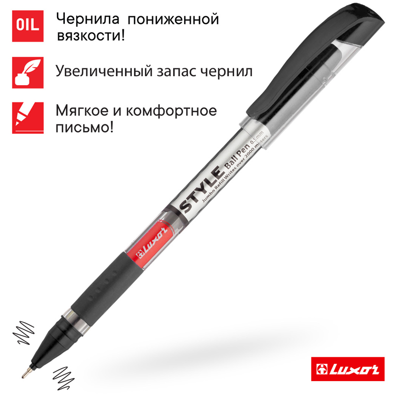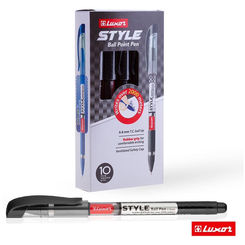 Шариковая ручка Luxor Style - функциональная ручка для ежедневного использования. Диаметр пишущего узла - 0,7 мм, что говорит о том, что изделие подходит для любого типа письма. Толщина линии письма составляет 0,5 мм. Ручка подходит для учебы, работы, для ведения документооборота, заметок в ежедневнике, рисунков в скетчбуке. Цвет чернил - чёрный. Изделия не имеют привычного кнопочного механизма подачи стержня, однако имеют прочный колпачок с с пластиковым клипом. Он позволит прикрепить ручку к ежедневнику или блокноту. Чернила изготовлены на масляной основе и благодаря пониженной вязкости они обеспечивают мягкое ровное письмо и уверенное скольжение по бумаге. Корпус изделия круглый и украшен резиновым грипом, а значит при письме напряжение на руку не ощущается. Набор из 10 ручек упакован в картонную коробку.