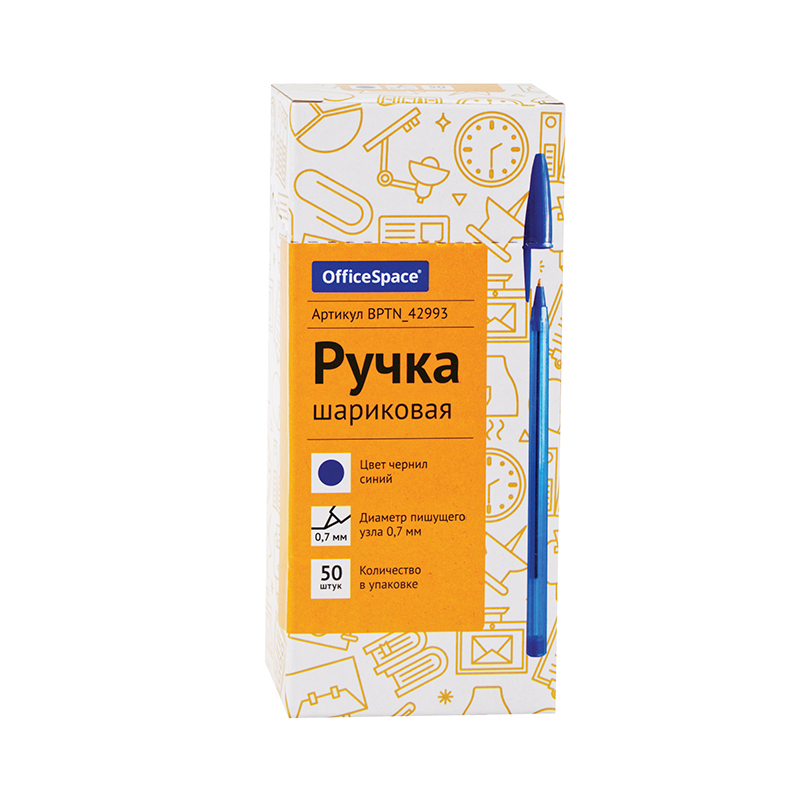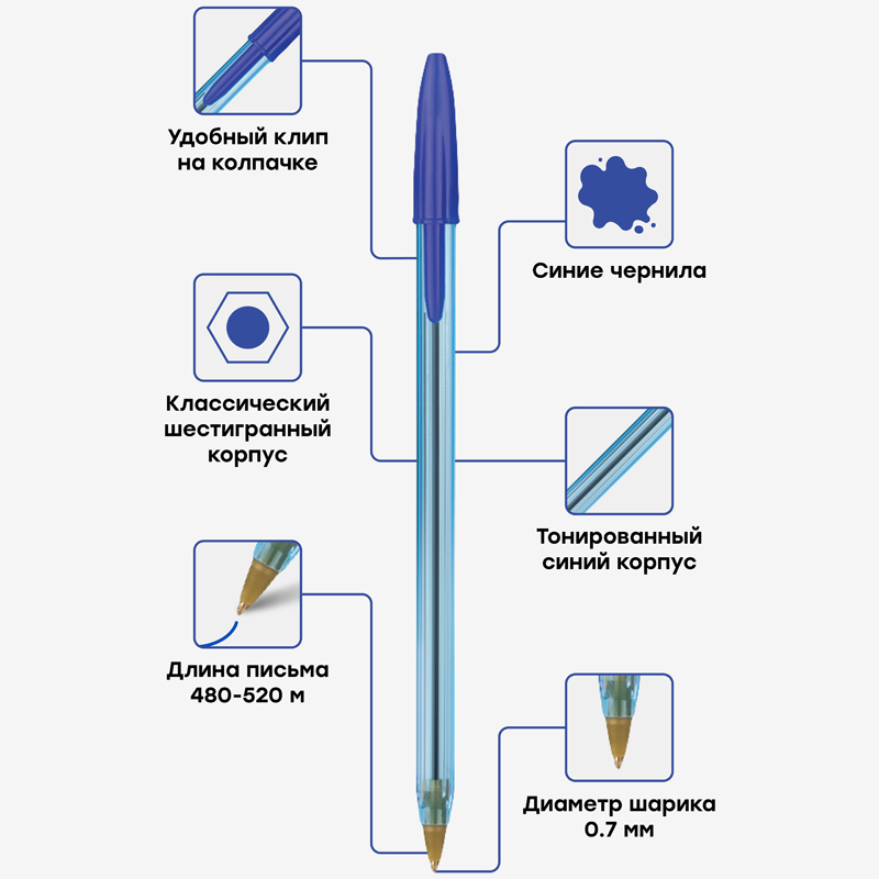Шариковая ручка с синими чернилами. Толщина линии - 0,5 мм. Корпус ручки - тонированный синий пластик.