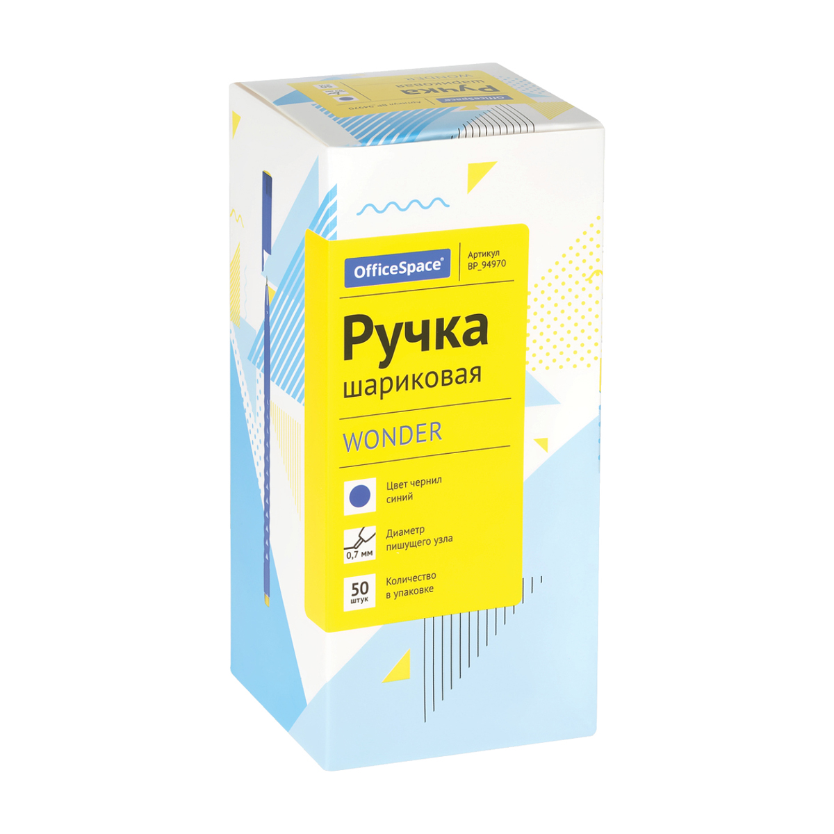 Шариковая ручка OfficeSpace Wonder – это помощник для учёбы и работы, который каждый день дарит яркое настроение. Ручка синего цвета представлена с игольчатым наконечником. Диаметр пишущего узла составляет 0,7 мм, поэтому ручка прекрасно подходит для любого стиля письма. Толщина линии письма составляет 0,5 мм, обеспечивая изящный и красивый почерк. Длина письма – 500 метров. Длина сменного стержня – 139 мм. Длина ручки – 149 мм. Корпус представлен в синем цвете с жёлтым элементом. Удобная круглая форма корпуса позволяет ручке комфортно лежать в руке. Благодаря клипу на колпачке модель можно закрепить на одежде, тетради или ежедневнике. Ручки упакованы в картонную коробку.<br/>• Цвет чернил: синий;<br/>• Толщина линии письма: 0,5 мм;<br/>• Цвет корпуса: синий;<br/>• Длина ручки 149 мм;<br/>• Длина письма: 500 метров;<br/>• Количество штук в упаковке: 50.