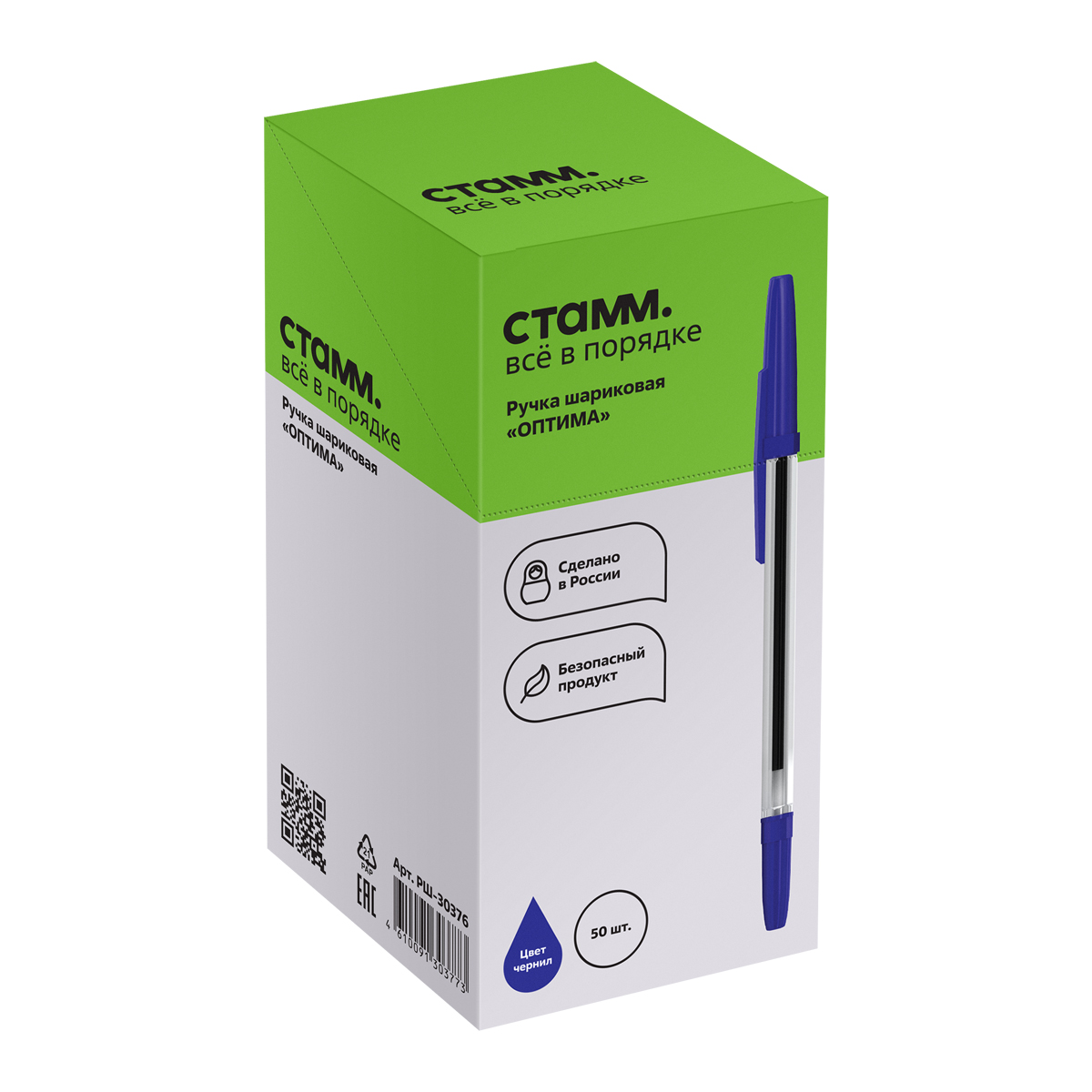 Шариковая ручка СТАММ «Оптима» — базовая пишущая принадлежность для работы и учёбы. Она комфортно лежит в руке благодаря классической шестигранной форме корпуса. Ручка оснащена вентилируемым колпачком. Прозрачный корпус позволяет контролировать расход чернил. Диаметр пишущего узла — 1 мм, толщина линии письма — 0,7 мм. Длина стержня — 133 мм. Износостойкий наконечник и чернила на масляной основе обеспечивают мягкое, ровное и комфортное письмо. За счёт качественных чернил насыщенного синего цвета ручка подходит для длительного использования на работе и учёбе. Ручки поставляются в картонной коробке по 50 штук.<br/> • Цвет чернил: синий;<br/> • Цвет корпуса: прозрачный;<br/> • Диаметр пишущего узла: 1 мм;<br/> • Толщина линии письма: 0,7 мм;<br/> • Форма корпуса: шестигранная;<br/> • Вентилируемый колпачок: да.