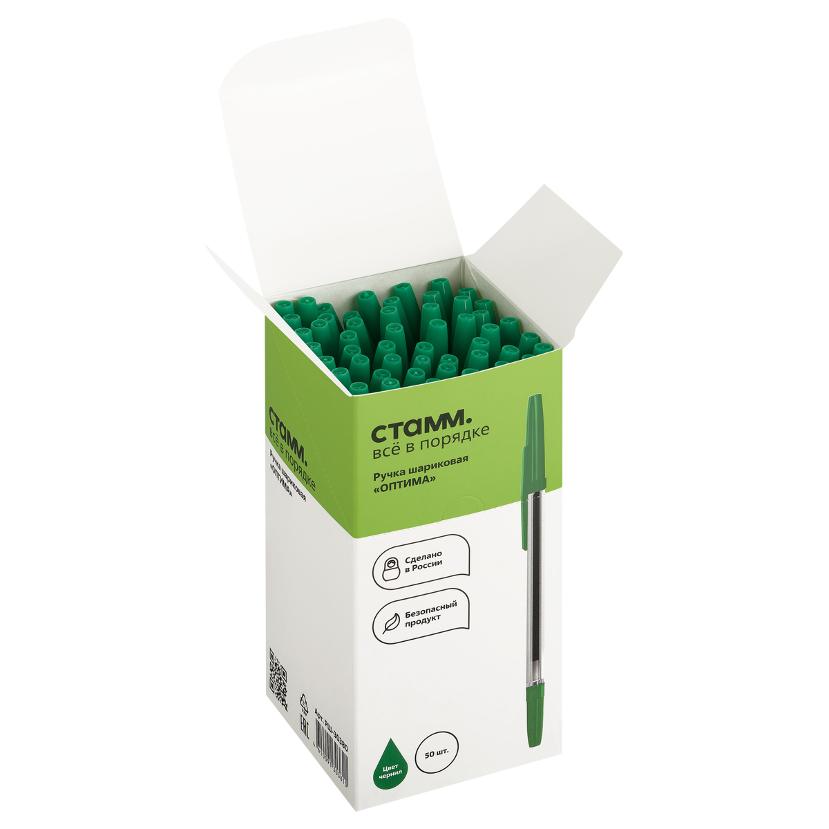 Шариковая ручка СТАММ «Оптима» — универсальная пишущая принадлежность для работы и учёбы. Она комфортно лежит в руке благодаря классической шестигранной форме корпуса. Ручка оснащена вентилируемым колпачком. Прозрачный корпус позволяет контролировать расход чернил. Диаметр пишущего узла — 1 мм, толщина линии письма — 0,7 мм. Длина стержня — 133 мм. Износостойкий наконечник и чернила на масляной основе обеспечивают мягкое, ровное и комфортное письмо. За счёт качественных чернил насыщенного зелёного цвета ручка подходит для длительного использования на работе и учёбе. Ручки поставляются в картонной коробке по 50 штук.