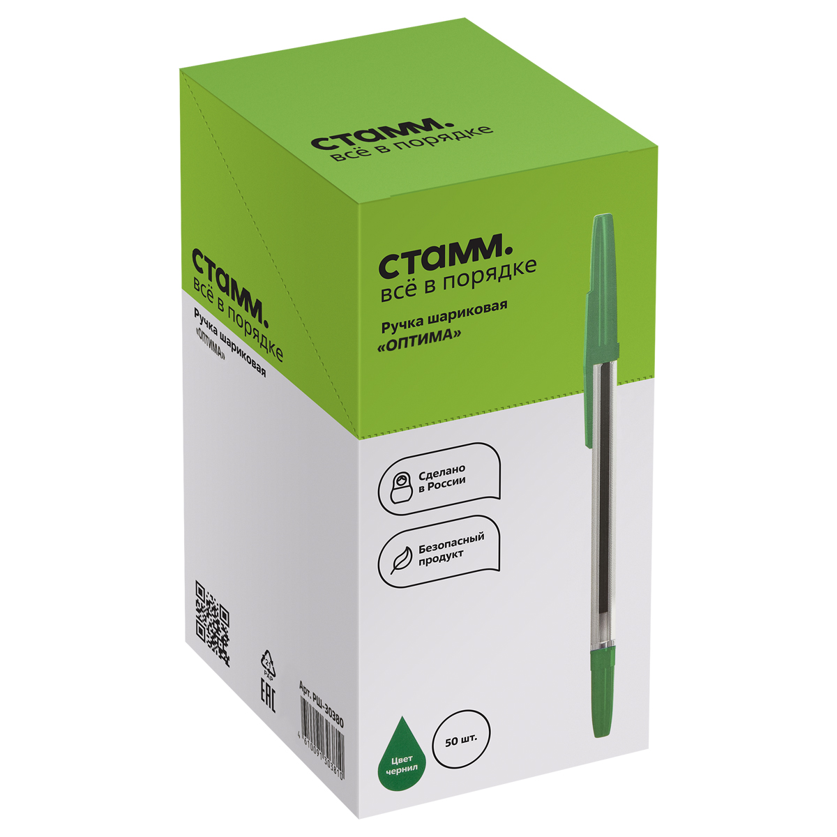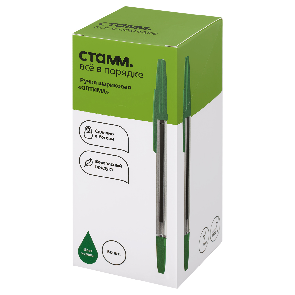 Шариковая ручка СТАММ «Оптима» — универсальная пишущая принадлежность для работы и учёбы. Она комфортно лежит в руке благодаря классической шестигранной форме корпуса. Ручка оснащена вентилируемым колпачком. Прозрачный корпус позволяет контролировать расход чернил. Диаметр пишущего узла — 1 мм, толщина линии письма — 0,7 мм. Длина стержня — 133 мм. Износостойкий наконечник и чернила на масляной основе обеспечивают мягкое, ровное и комфортное письмо. За счёт качественных чернил насыщенного зелёного цвета ручка подходит для длительного использования на работе и учёбе. Ручки поставляются в картонной коробке по 50 штук.<br/>• Цвет чернил: зелёный;<br/>• Цвет корпуса: прозрачный;<br/>• Диаметр пишущего узла: 1 мм;<br/>• Толщина линии письма: 0,7 мм;<br/>• Форма корпуса: шестигранная;<br/>• Вентилируемый колпачок: да.