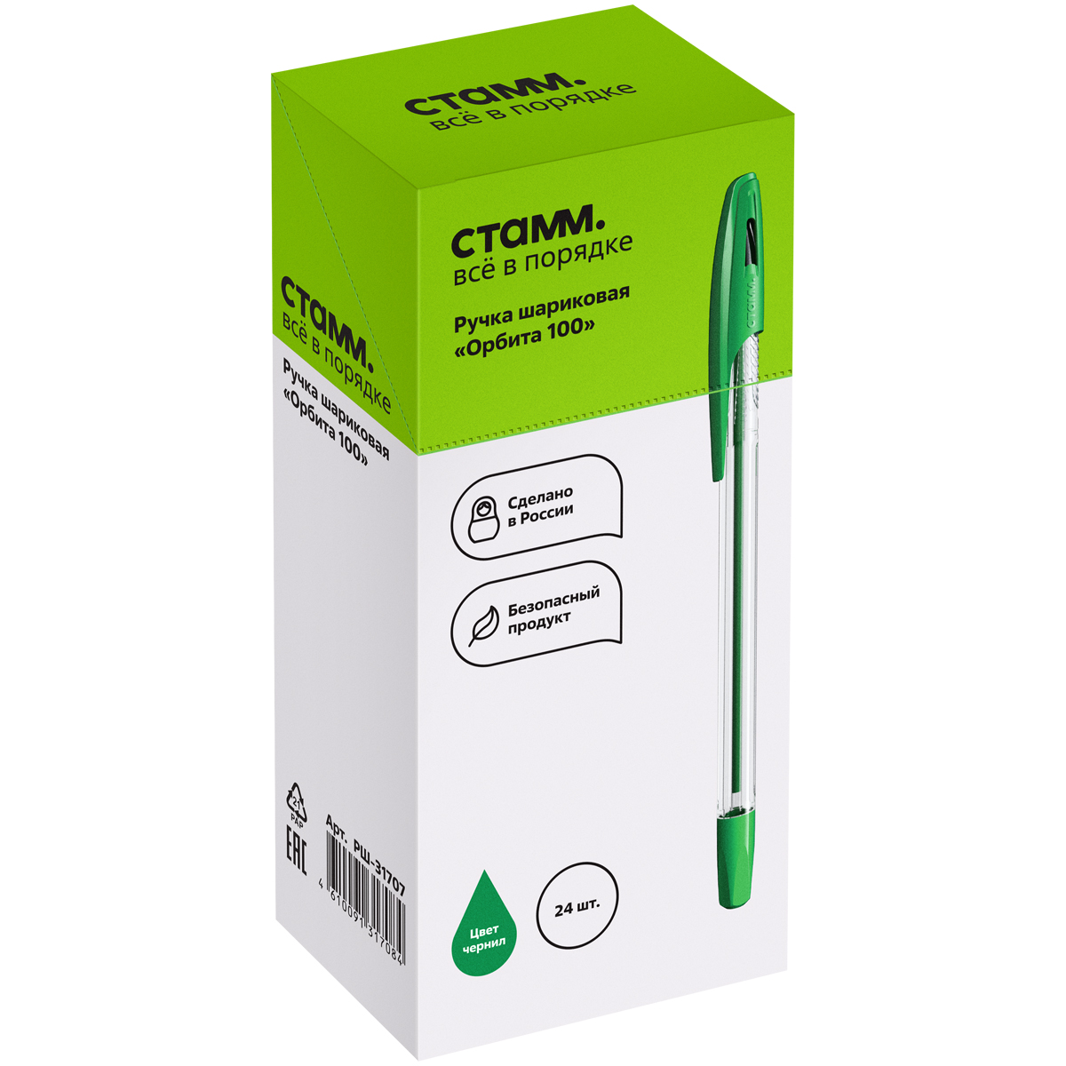 Шариковая ручка СТАММ "Орбита 100" изготовлена из качественных материалов и идеально сочетает в себе функциональность и современный дизайн. Благодаря классической шестигранной форме корпуса ручка комфортно лежит в руке. Эргономичная зона захвата с рифлением препятствует скольжению пальцев, что делает ее использование максимально комфортным. Ручка оснащена вентилируемым колпачком, который обеспечивает дополнительную безопасность при использовании детьми. Прозрачный корпус позволяет контролировать расход чернил. Диаметр пишущего узла: 0,7 мм, толщина линии письма: 0,5 мм. Длина стержня: 142 мм. Износостойкий наконечник и чернила на масляной основе обеспечивают мягкое, ровное и комфортное письмо. Ручки поставляются в картонной коробке по 24 штуки.<br/><br/>• Цвет чернил: зелёный;<br/>• Цвет корпуса: прозрачный;<br/>• Диаметр пишущего узла: 0,7 мм;<br/>• Толщина линии письма: 0,5 мм;<br/>• Форма корпуса: шестигранная;<br/>• Вентилируемый колпачок: да.