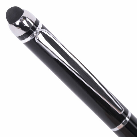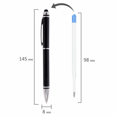 Подходит для всех видов смартфонов (в том числе iPhone) и электронных планшетов (в том числе iPad) с дисплеями «touch screen» (емкостные экраны). Корпус ручки-стилуса выполнен из металла черного цвета с деталями под серебро. Стержень типа "Parker" имеет длину 98 мм. Ширина линии письма составляет 1 мм. Цвет чернил - синий.