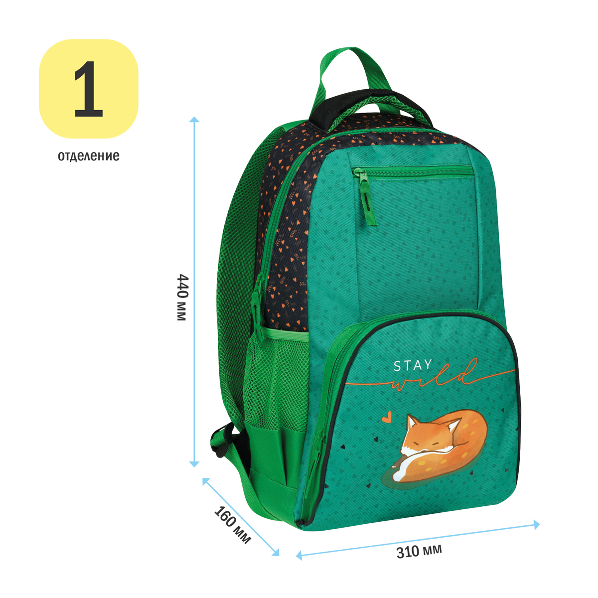 Рюкзак для средних и старших классов ArtSpace School Foxy размером 44*31*16 см и объемом 21,88 литра с одним отделением, двумя боковыми сетчатыми и двумя внешними карманами на молнии. Внутри основного отделения есть карман для документов. Рюкзак сделан из прочного износостойкого полиэстера. Спинка и лямки уплотнены слоем спонжа толщиной 5 мм.