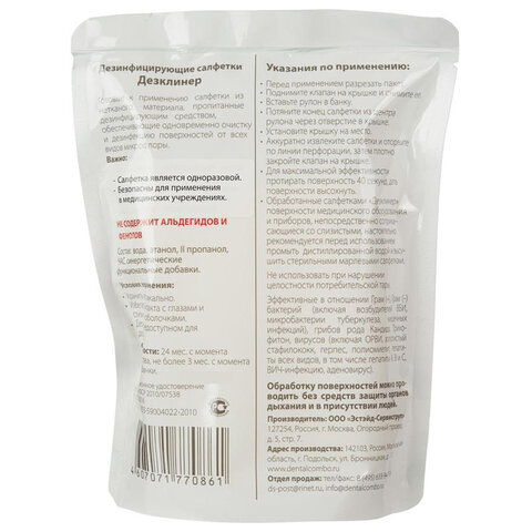 Салфетки «Дезклинер» активно разрушают на поверхностях биологические пленки; обладают хорошими моющими свойствами. Салфетки обладают высокой прочностью; при использовании не рвутся, не сбиваются в комок и не оставляют остаточной пленки на обработанной поверхности; совместимы с материалами медицинского оборудования (кроме подверженных воздействию спиртов).