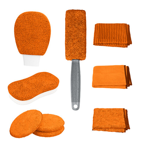 Салфетки 4шт с размером 25х25 см. Салфетка для стекла с плотностью 280г/м2 - 1 штука, салфетки из микрофибры с плотностью 240г/м2 - 2 штуки, салфетка для удаления разводов с плотностью 300г/м2 - 1 штука. Цвет оранжевый.