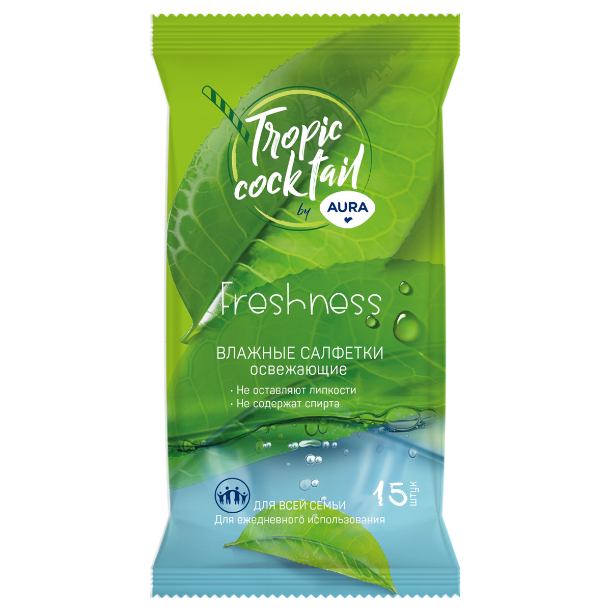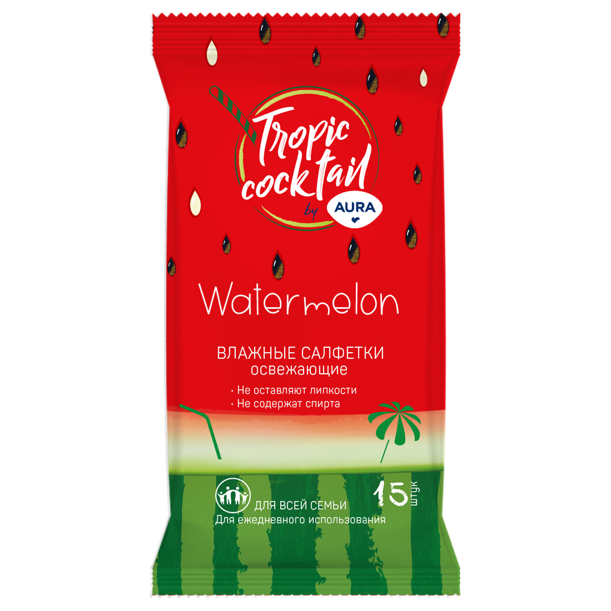 Влажные салфетки из нетканого полотна, пропитанные лосьоном (вода,бензоат натрия,пропиленгликоль) с отдушкой "тропический коктейль" в цефленовом пакете с клапаном. В количестве 15 шт.