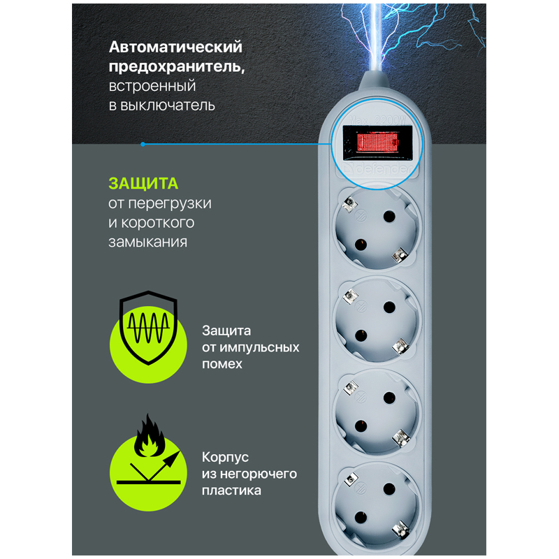 Удлинитель-сетевой фильтр Defender ES – экономичный вариант решения проблемы защиты электропитания. Предназначен для подключения широкого спектра бытовой и электронной техники, включая чайники и электронагреватели. Сетевой фильтр Defender имеет 4 розеток евростандарт, защищает электронную технику от короткого замыкания, перегрузок по току и импульсных помех. Компактный корпус сетевого фильтра выполнен из прочного негорючего пластика, сетевой шнур и контакты розеток - из чистой меди.