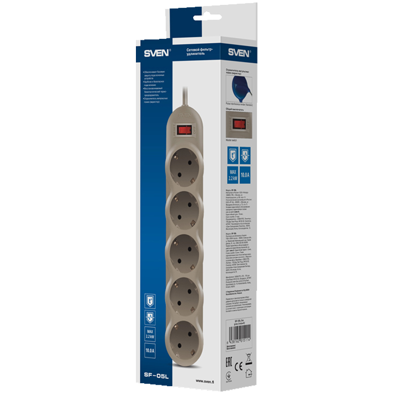 Сетевой фильтр SVEN – оптимальное решение для обустройства рабочего места дома или в офисе. Модель имеет выключатель со световой индикацией рабочего состояния. Она оснащена варистором и имеет восстанавливаемый биметаллический предохранитель. С сетевым фильтром от SVEN ваша техника будет под надежной защитой.<br/><br/>SVEN SF-05L выпускается в разных модификациях. У этой модели есть три варианта длины провода – 1.8, 3 и 5 метров. <br/><br/>Модель приятно держать в руках – продуманная конструкция, хорошая сборка, качественная картонная упаковка – все детали продукта проработаны до мелочей. При этом цена способна приятно удивить.