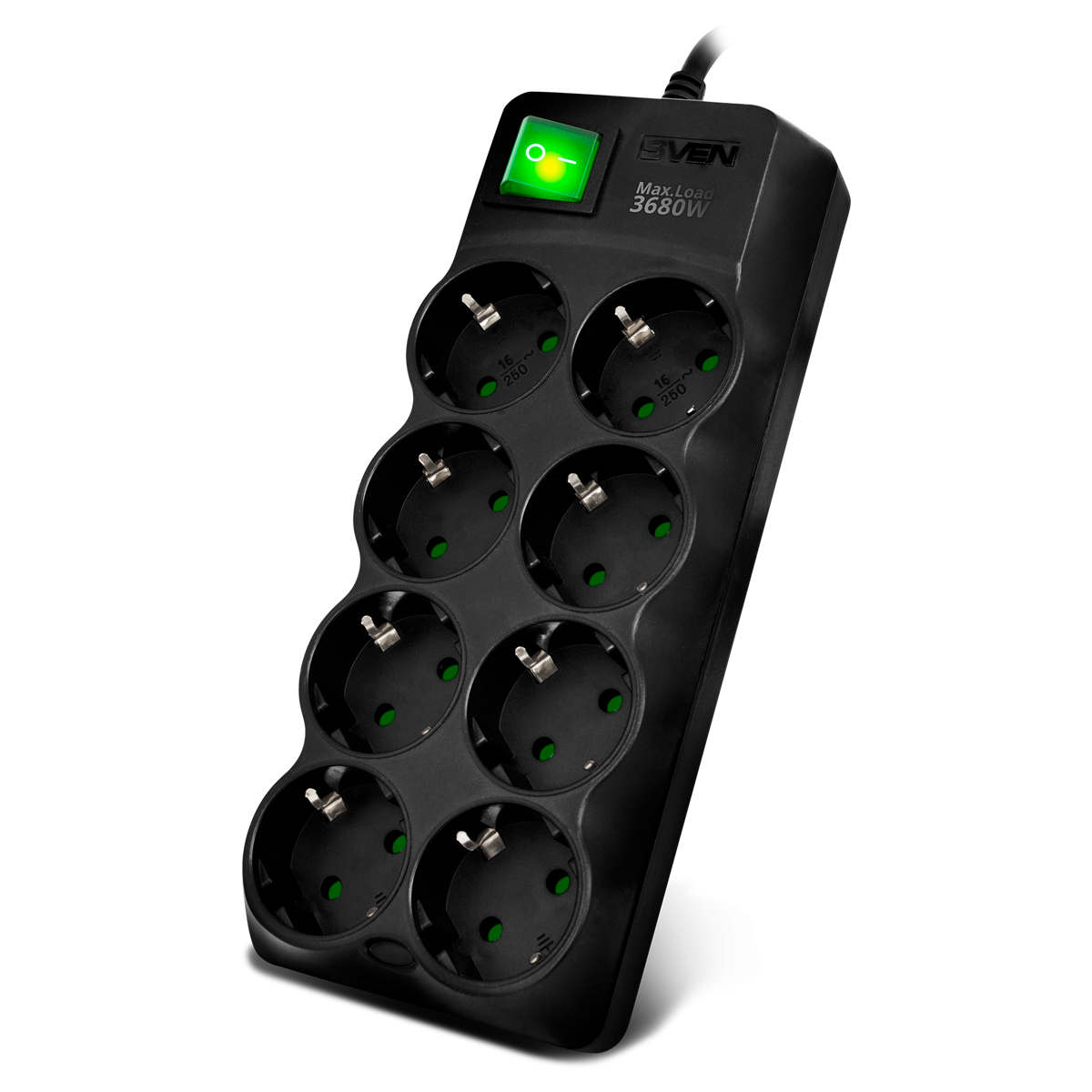Сетевой фильтр Sven SF-08E-16, 8 розеток с защитными шторками 1,8м, черный