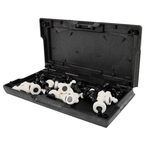 Шахматы магнитные имеют удобный размер – доска 25х25см достаточно компактна и легко поместится в сумку или рюкзак. Фигуры изготовлены из прочного пластика с магнитными основаниями, что делает их лёгкими, долговечными и устойчивыми на поле. Доска выполнена из качественного пластика и имеет складную конструкцию, внутри которой предусмотрено место для хранения фигур. Защёлка предотвращает случайное открытие доски.