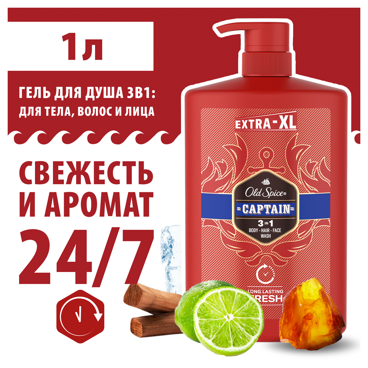Представь, что мир, который ты жаждешь покорить, – это устрица. Так вот, мужской гель для душа Old Spice (Олд Спайс) Captain 3в1 (для тела, волос и лица) – это нож, который поможет раскрыть створки ее раковины, секретное оружие, которое не знает неудач. Даже когда ты не покоряешь открытые моря, ты покоряешь помещения, наполняя их свежим чистым ароматом цитруса, сандалового дерева, соленых брызг океана и попутного ветра. Хочешь, чтобы твоя эскадра побеждала по всем фронтам? Проще простого – надо просто найти именно свой аромат! Освежающая пена геля для душа и шампуня Old Spice в extra-XL упаковке 1 л борется с неприятными запахами, наполняя тебя капитанской решительностью, смелостью и отвагой с чистыми зелеными нотами цитрусовых. Зарядись энергией и мощью Old Spice с самого утра – попробуй гель для душа+шампунь 3в1 Captain, затем нанеси дезодорант из этой же коллекции (стик или спрей), чтобы потопить неприятный запах пота. Преимущества: - Гель для душа+шампунь 3в1 - для тех, у кого есть тело, волосы и лицо; - До 100 дней свежести; - Грязь и запах смывает, мужичайший аромат и свежесть оставляет; - Динамичный яркий аромат, который будет с тобой весь день