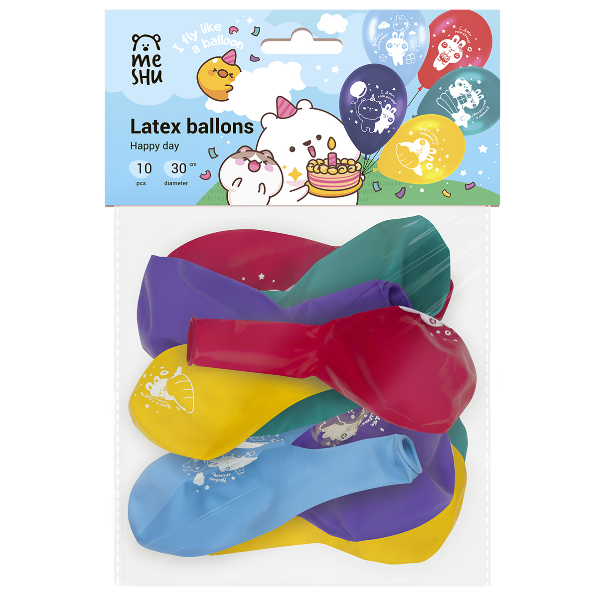 Набор воздушных шаров MESHU "Happy day" поможет оформить помещение для проведения тематической вечеринки или детского праздника. Шарики подойдут в качестве дополнения к подарку имениннику. В мини-набор входят 10 штук в пастельных оттенках с рисунками. Размер одного шарика — 30 см. Шары сделаны из натурального латекса, поэтому не имеют неприятного химического запаха.<br/>Набор упакован в яркий индивидуальный пакет с европодвесом. Дизайн упаковки с милыми персонажами создаст праздничное настроение. Шарики поставляются в ненадутом виде.<br/>• Материал: натуральный латекс;<br/>• Размер: 30 см;<br/>• Цвет: ассорти;<br/>• Индивидуальная упаковка: пакет с европодвесом.
