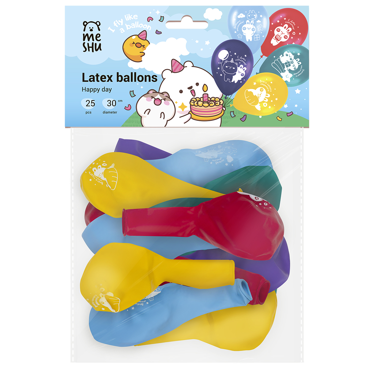 Набор воздушных шаров MESHU "Happy day" поможет оформить помещение для проведения тематической вечеринки или детского праздника. Шарики подойдут в качестве дополнения к подарку имениннику. В мини-набор входят 25 штук в пастельных оттенках с рисунками. Размер одного шарика — 30 см. Шары сделаны из натурального латекса, поэтому не имеют неприятного химического запаха.<br/>Набор упакован в яркий индивидуальный пакет с европодвесом. Дизайн упаковки с милыми персонажами создаст праздничное настроение. Шарики поставляются в ненадутом виде.<br/>• Материал: натуральный латекс;<br/>• Размер: 30 см;<br/>• Цвет: ассорти;<br/>• Индивидуальная упаковка: пакет с европодвесом.