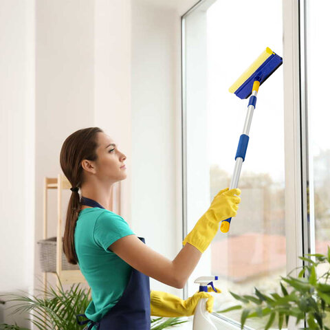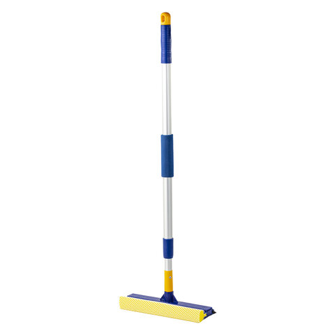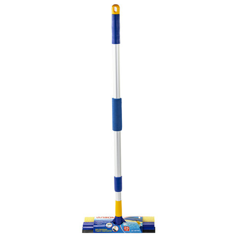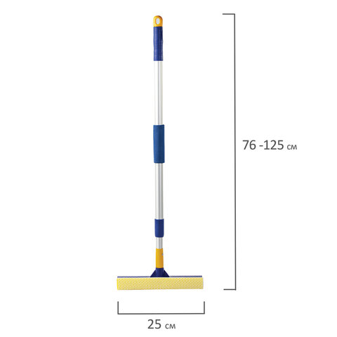 Выполняет две функции: мытье стеклянной поверхности с помощью спонжа и сгон воды резиновым лезвием. Телескопическая ручка с вращающейся рабочей частью упрощает уборку. Ручка выполнена из алюминия. Длина телескопической ручки - 76-125 см. Ширина рабочей части - 25 см.