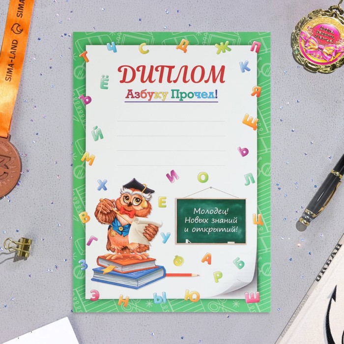 Диплом "Азбуку прочел!" сова, бумага, А4