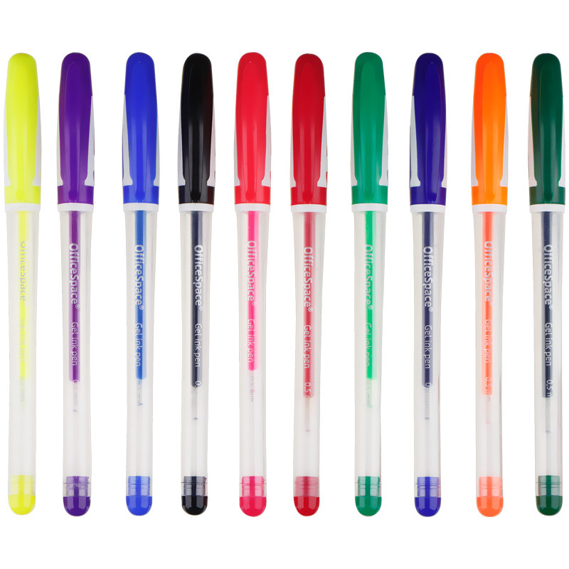 Набор гелевых ручек OfficeSpace – это удобство в использовании и отличное качество. Внутри ручки в прозрачном корпусе – гелевые чернила, которые ярко пишут на бумаге. На каждой модели есть колпачок с клипом – можно закрепить её на одежде или тетради. Диаметр пишущего узла 0,5 мм, благодаря чему ручка мягко пишет без нажима. Цвета чернил: синий, голубой, зеленый, салатовый, фиолетовый, оранжевый, желтый, красный, розовый, черный. В наборе 10 ручек, упаковка – чехол из ПВХ с европодвесом.<br/>• Цвет чернил: ассорти;<br/>• Толщина линии письма: 0,3 мм;<br/>• Длина письма: 200-250 метров;<br/>• Цвет корпуса:прозрачный;<br/>• Эргономичный резиновый держатель;<br/>• Количество штук в упаковке: 10;<br/>• Тип упаковки: пвх-чехол европодвесом.