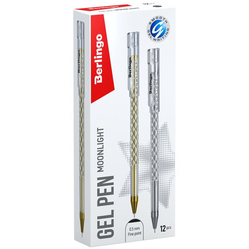 Гелевая ручка Berlingo "Moonlight" выполнена в изящном круглом корпусе с оригинальной отделкой золотой и серебристой фольгой. Стержень украшен в цвет отделки корпуса, что в комплексе дает уникальное дизайнерское решение. Поставляется в коробочках по 12 штук: 6 золотых и 6 серебряных. Диаметр пишущего узла составляет 0,5 мм, благодаря чему получается тонкая, аккуратная линия. <br/>- Цвет чернил: черный;<br/>- Толщина линии письма: 0,3 мм;<br/>- Длина письма: 400 м;<br/>- Цвет корпуса: ассорти;<br/>- Количество штук в упаковке: 12;<br/>- Тип упаковки: картонная коробка.