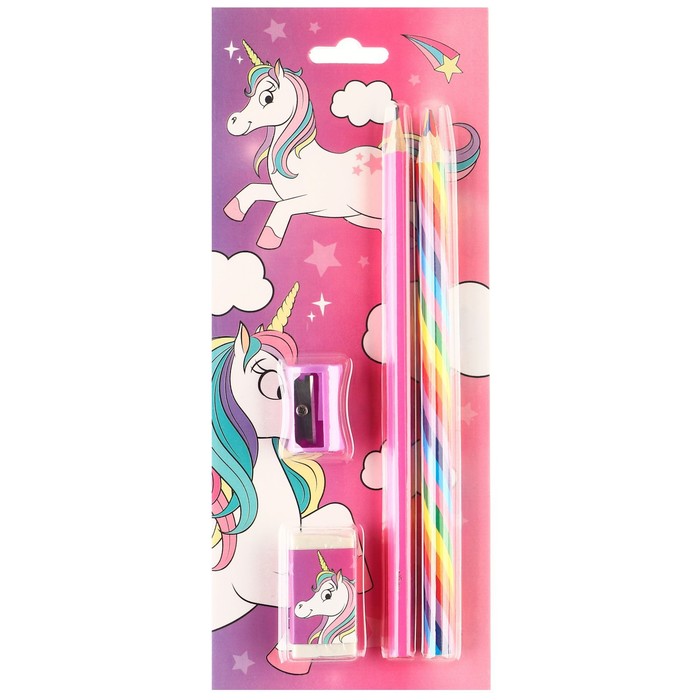 Набор канцелярский Calligrata 9 предметов, 4 чернографитных карандаша, точилка, ластик, линейка, ручка, насадка-тренажер, розовый