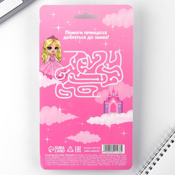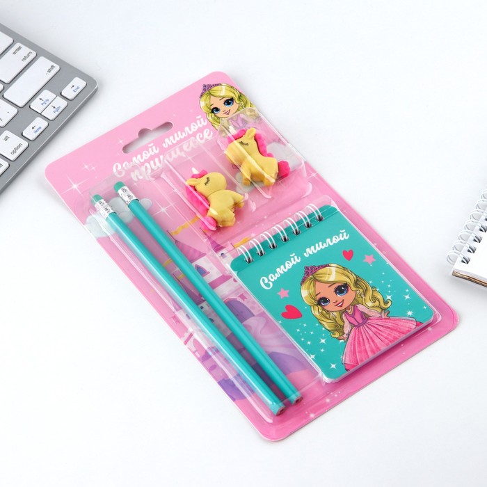 Набор канцелярский Calligrata 9 предметов, 4 чернографитных карандаша, точилка, ластик, линейка, ручка, насадка-тренажер, розовый