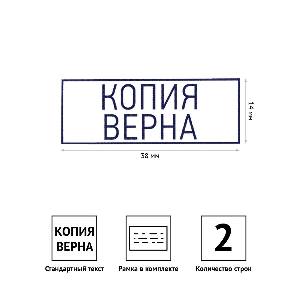 Автоматический пластиковый штамп OfficeSpace со стандартным текстом «КОПИЯ ВЕРНА» с рамкой. Размер поля 38х14 мм, 2 строки фиксированного текста. Оттиск из высококачественной резины. Сменная штемпельная подушка в комплекте (срок годности сменной подушки - 6 лет, дата изготовления указана на упаковке). Легкая замена штемпельной подушки. Усиленные двойные стенки выкатного механизма. Долговечность, благодаря металлической втулке. Высота букв 5 мм, оттиск - 2 строки. Упаковка - блистер с европодвесом.<br/>• Тип: стандартный;<br/>• Материал корпуса: пластик:<br/>• Кол-во строк: 2;<br/>• Размер оттиска: 38*14 мм.