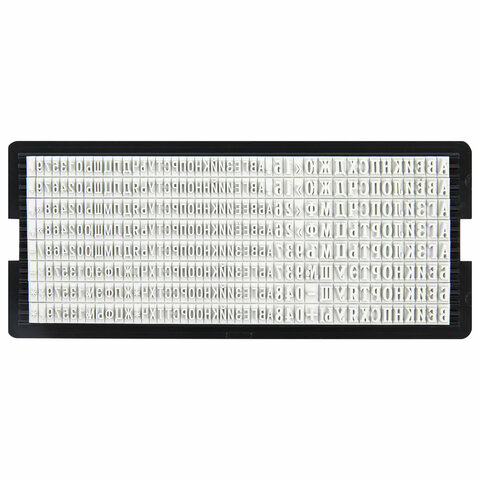 Размер текстовой платы 47х18 мм. Модель оснащена кнопкой блокировки, специальные держатели на подушке, предотвращают вероятность испачкать пальцы. В комплект также входят: пинцет, 1 касса символов.