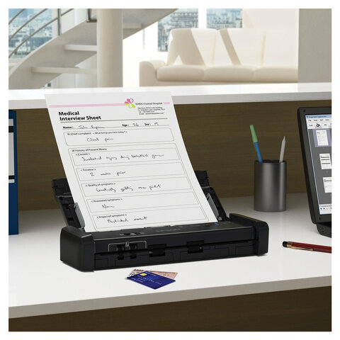 Сканер Epson WorkForce DS-310 имеет компактные размеры для переноса в сумке и хранения в ящике рабочего стола. Кроме того, в комплект входит автоподатчик документов на 20 страниц, что позволяет использовать его так же, как настольное решение для потокового сканирования.