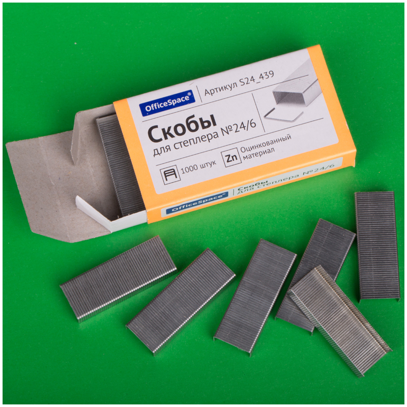 Скобы канцелярские № 24/6 OfficeSpace оцинкованные подойдут для скрепления листов бумаги. Скобы упакованы в картонную коробочку по 1000 штук. Канцелярские скобы изготовлены из оцинкованного материала. Скобы надежно сшивают до 30 листов. <br/>• Количество: 1000 штук;<br/>• № скобы: 24/6;<br/>• Покрытие: оцинкованное;<br/>• Количество скрепляемых листов: до 30