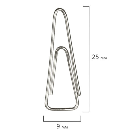 Скрепки изготовлены из стали, имеют треугольную форму и блестящее никелевое покрытие. Длина скрепки составляет 25 мм. Не окисляются и не повреждают документы. 100 штук в картонной коробке.