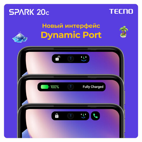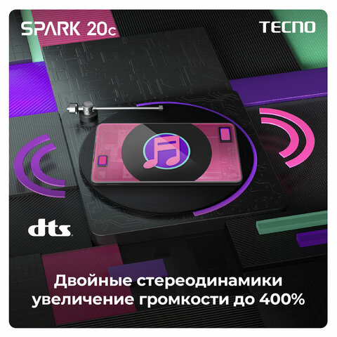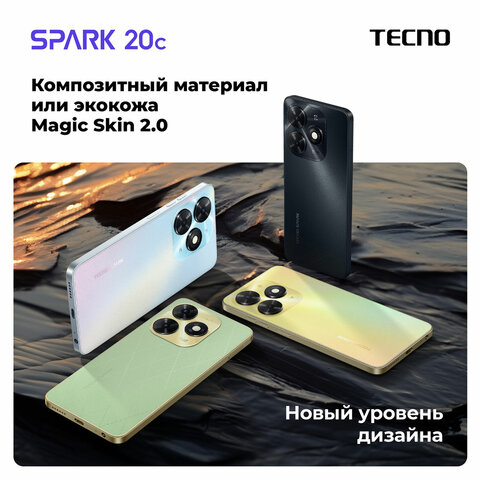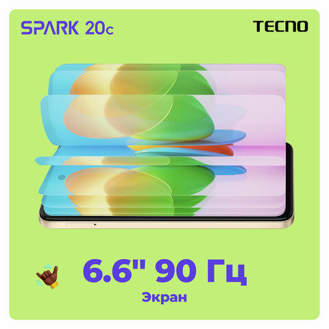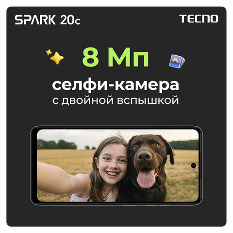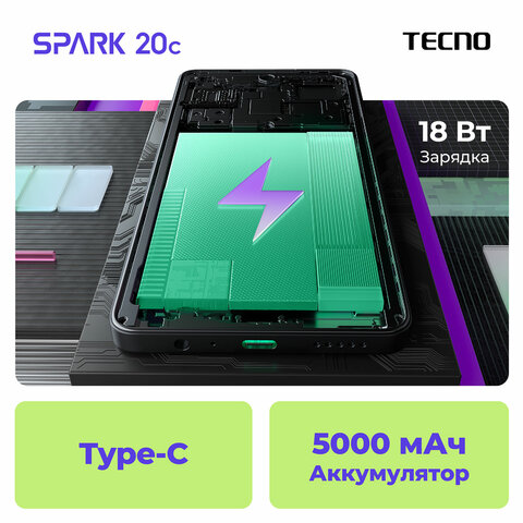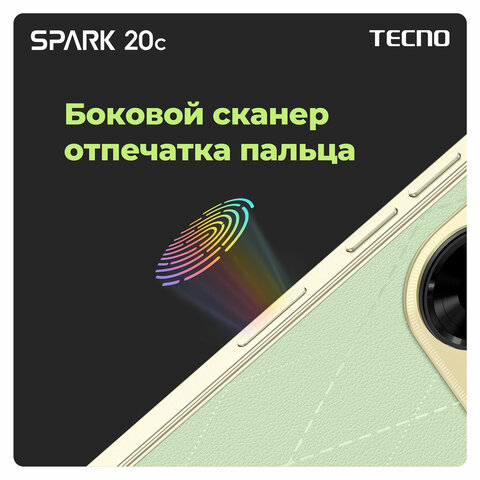 На задней стороне Tecno SPARK 20C размещена основная камера 50+0.08 Мп с двойной светодиодной вспышкой и автофокусом. Для селфи установлена камера 8 Мп. С помощью модуля NFC можно оплачивать покупки бесконтактным способом. На боковой грани есть сканер отпечатков пальцев для простой и безопасной авторизации. Автономная работа смартфона основана на аккумуляторе емкостью 5000 мА*ч с функцией ускоренной зарядки.